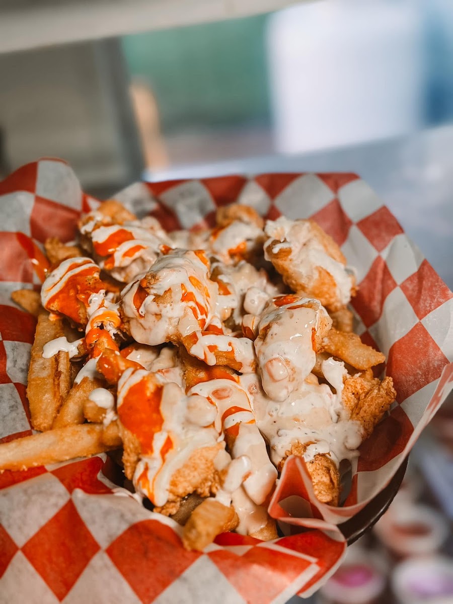 (4) house made marinated chicken tenders deep fired and served with fired, toast, and white gravy