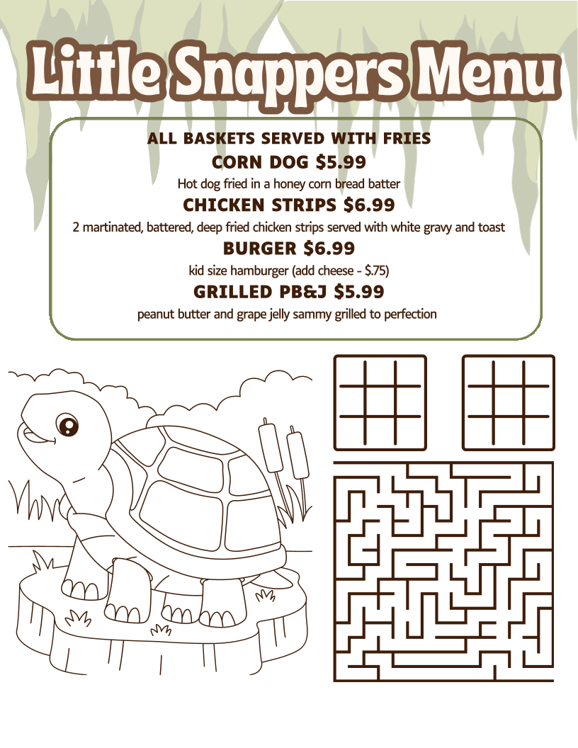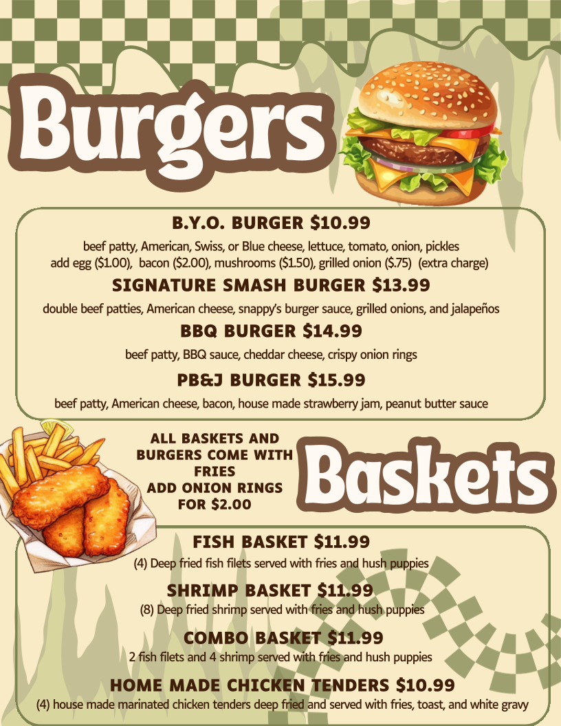 In addition to the burgers and sandwiches, Snappy's Roadhouse offers an assortment of baskets that are perfect for a quick meal or a casual dinner. The Fish Basket, Shrimp Basket, and Combo Basket are great options for those who want to try a bit of everything. And, of course, their Homemade Chicken Tenders are a great go-to for anyone who loves crispy, flavorful comfort food. Whether you're stopping by for a hearty meal or a light bite, Snappy's Roadhouse Menu has something for everyone, with flavorful dishes that highlight the best of Southern comfort food and more.