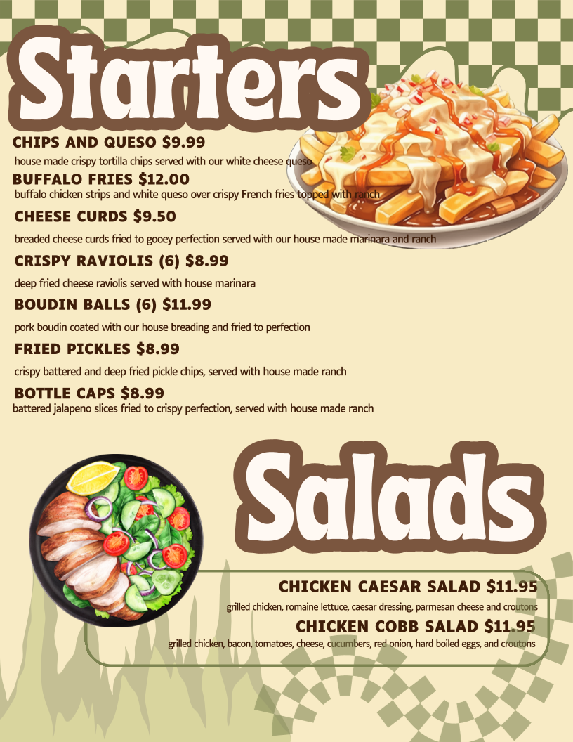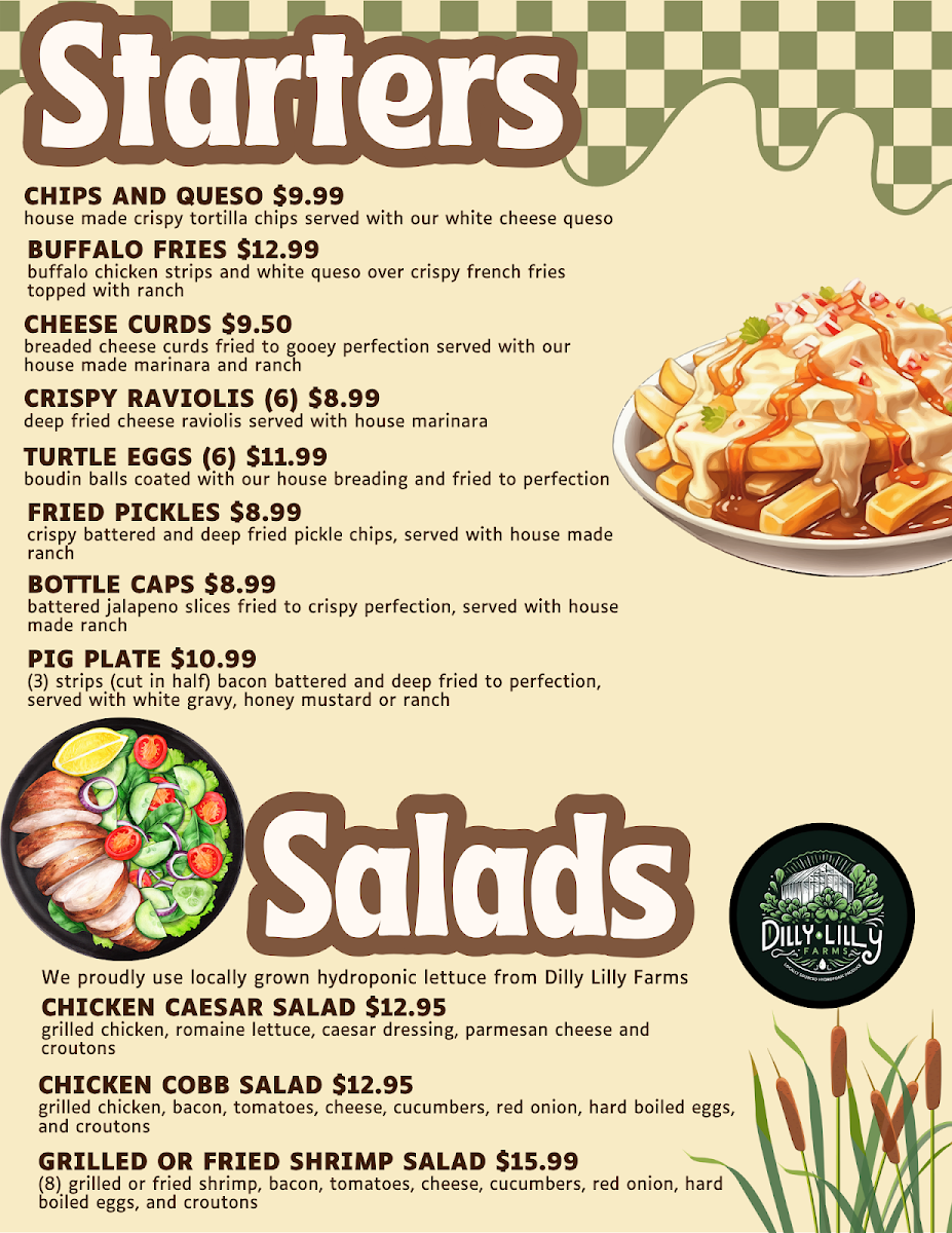 The Snappy's Roadhouse Menu offers a wide variety of delicious options that cater to different tastes, making it an ideal stop for anyone in the Anahuac, TX area. To start, you'll find tempting appetizers like Chips & Queso, crispy Raviolis, and Cheese Curds, perfect for sharing with friends. If you're in the mood for something a little heartier, the Pig Plate is an indulgent choice, while Bottle Caps offer a delightful crunch. For wing lovers, Snappy’s serves up options in quantities of 6, 10, 15, or 20, with a variety of flavors to satisfy any craving. If you're craving a fresh and filling salad, you can choose from classics like the Chicken Cobb Salad, Chicken Caesar Salad, or the refreshing Grilled Shrimp Salad and Fried Shrimp Salad.
