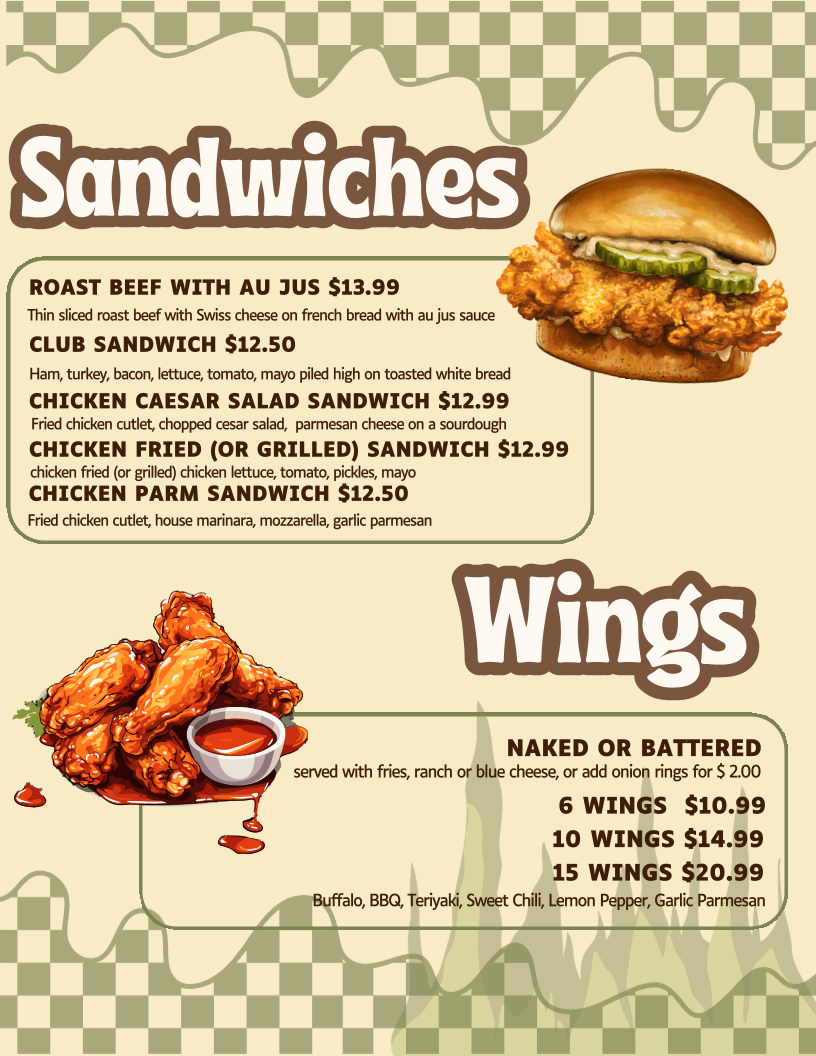 For sandwich lovers, the menu features a variety of choices, including the comfort-filled Chicken Fried Sandwich, the fresh Chicken Caesar Salad Sandwich, and the savory Roast Beef with Au Jus. If you're in the mood for something classic, the Club Sandwich and Chicken Parm Sandwich are delicious options that will surely satisfy your cravings.